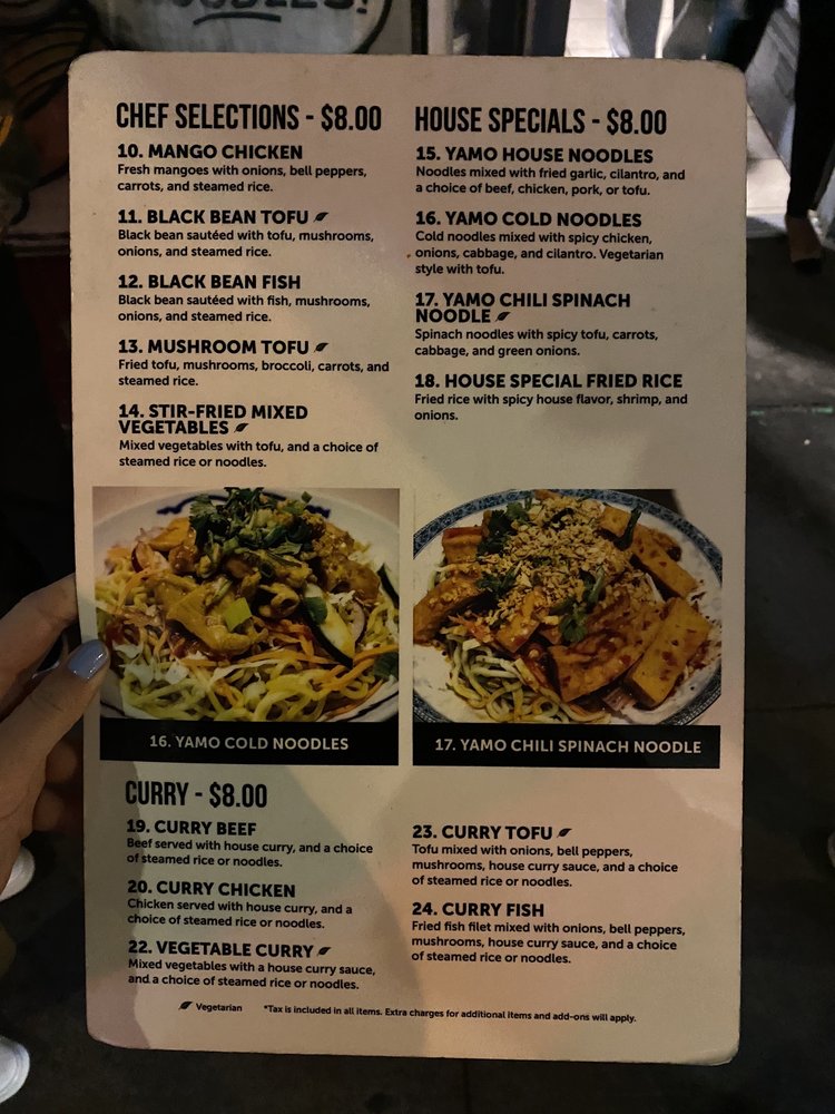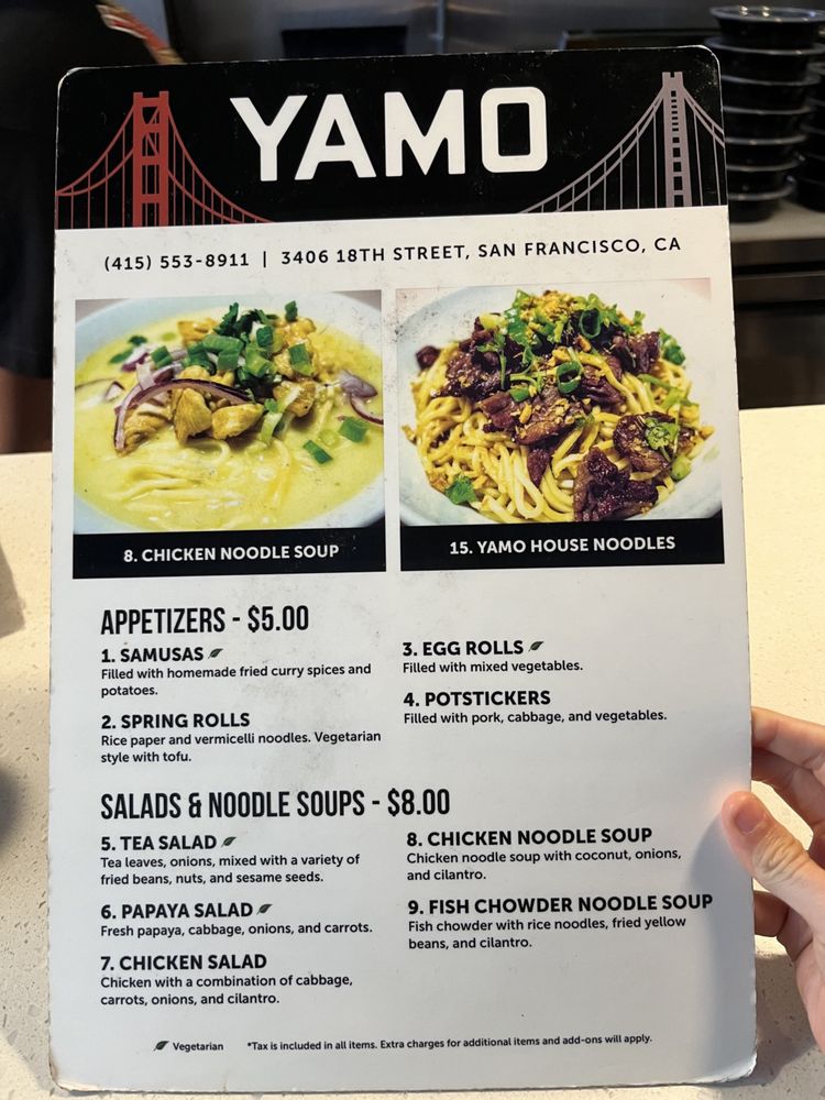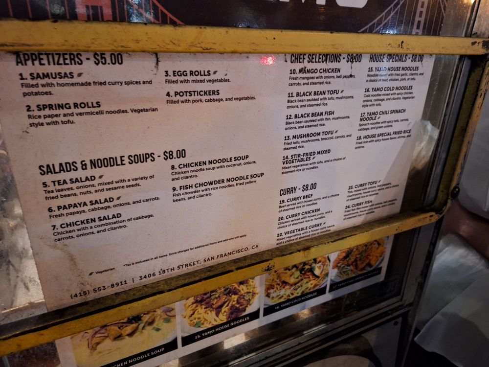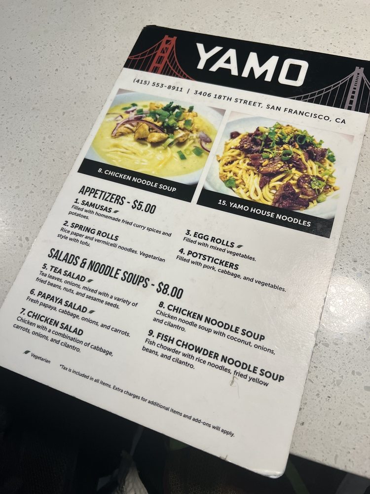 Introducing the menu at Yamo, a cozy Burmese restaurant in San Francisco. The diverse menu offers a wide selection of appetizers, chef selections, beverages, and more. Highlights include the popular Tea Leaf Salad and House Noodles with beef. Customers rave about the freshness of the ingredients and the intimate cooking experience. The small, family-run establishment provides a unique dining atmosphere with a limited number of counter seats. Dishes like the Yamo House Noodles and Samusas receive high praise for their flavorful taste and affordable prices. Cash-only policy adds to the charm of this hidden gem in the Mission district. If you're looking for a delicious and authentic Burmese dining experience, give Yamo a try.