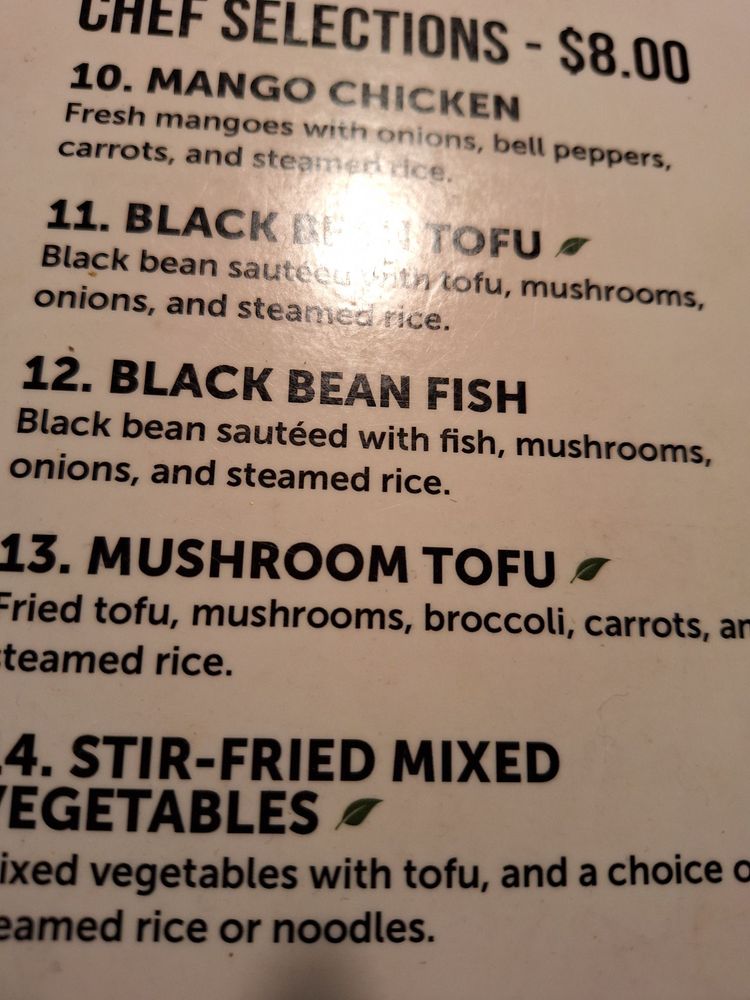 black bean sauteed with fish, mushroom, onion, peppers and steam rice